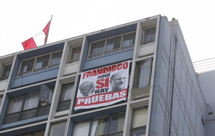 A protest banner that says in Spanish, "Yes, Francis, here there is proof," hangs near the cathedral in Lima, Peru, January 21. The banner protests Pope Francis' defense of Bishop Juan Barros of Osorno, Chile, who is accused of protecting a priest the Vatican found guilty of sexual abuse of minors. (CNS photo/Paul Haring)