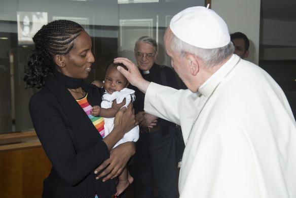 Mariam Yahya Ibrahim, whose sentence and detention triggered international outrage, walked off the aircraft cradling her baby and was greeted by Italian prime minister Matteo Renzi. Soon afterwards, Ibrahim, her husband and two children had a private meeting with Pope Francis in the Vatican. "The Pope thanked her for her witness to faith," Vatican spokesman Father Federico Lombardi said.